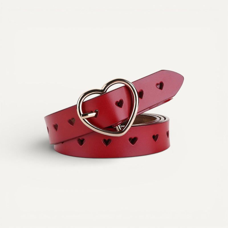 La boucle en forme de cœur, en métal doré brillant, constitue l’élément central de ce modèle. Son motif épuré et symbolique met en valeur l’esprit féminin de la ceinture, tout en créant un contraste harmonieux avec la teinte rouge du cuir. La finition lisse et lumineuse de la boucle apporte une touche chic et précieuse.